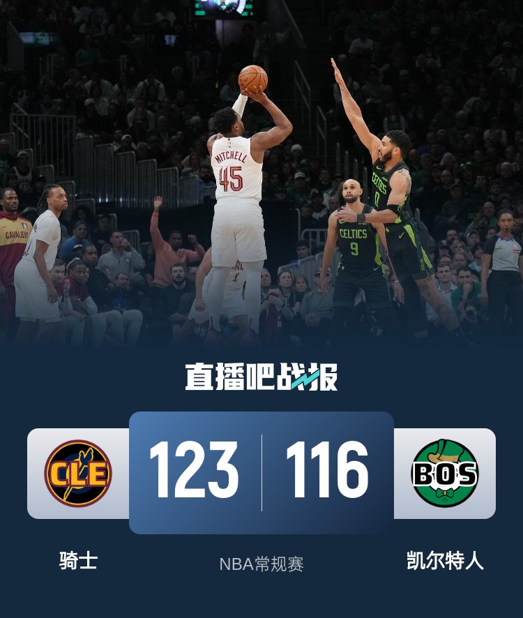 开场后凯尔特人外线手感火热连中三分,他们5分钟时间轰出一波25-3的攻势早早建立领先,随后加兰连续突破得手,杰罗姆替补登场后带领轮换阵容开始追分。第二节骑士的轮换阵容继续追分,他们上来掀起反扑追到只差2分,怀特两记三分止血,塔图姆和布朗也轮番拿分,凯尔特人在半场结束时再度将分差拉大到10分。易边再战,虽然米切尔上演强势暴扣,但是塔图姆和布朗状态依旧神勇,他们联手拿分帮助凯尔特人再次拉开比分,但随后米切尔暴走个人独自轰出10-0的攻势追到只差1分。末节决战骑士依旧势头凶猛,莫布里命中三分帮助骑士反超比分,虽然塔图姆及时站出来,但米切尔毫不示弱帮助骑士建立领先,凯尔特人后继乏力,最终骑士123-116大逆转凯尔特人豪取9连胜,凯尔特人遭遇2连败。