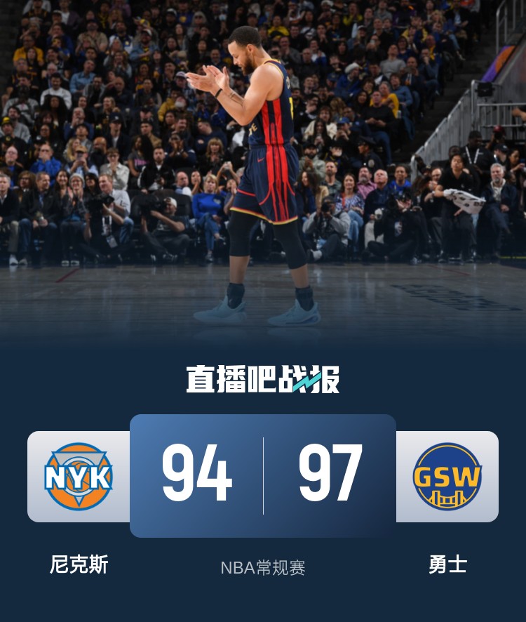首节之争双方进攻端状态都非常不错一路交替拿分,第一节双方10次互换领先最大差距不过5分;次节两队状态有所回落但场面仍然僵持,尼克斯方面多点开花上半场首发里4人得分上双,勇士这边得分点同样分散10人轮换全部有得分入账,库里上半场最后的三分为勇士取得4分优势进入下半场。休息归来双方持续拉锯,勇士靠着库里的连续拿分守住微弱优势,但尼克斯在末节的不断反扑追平比分将悬念留到最后,不过决胜时刻勇士关键一帽外加唐斯和麦克布莱德的连续致命失误导致尼克斯的努力被葬送。最终,勇士主场力克尼克斯迎来7连胜。