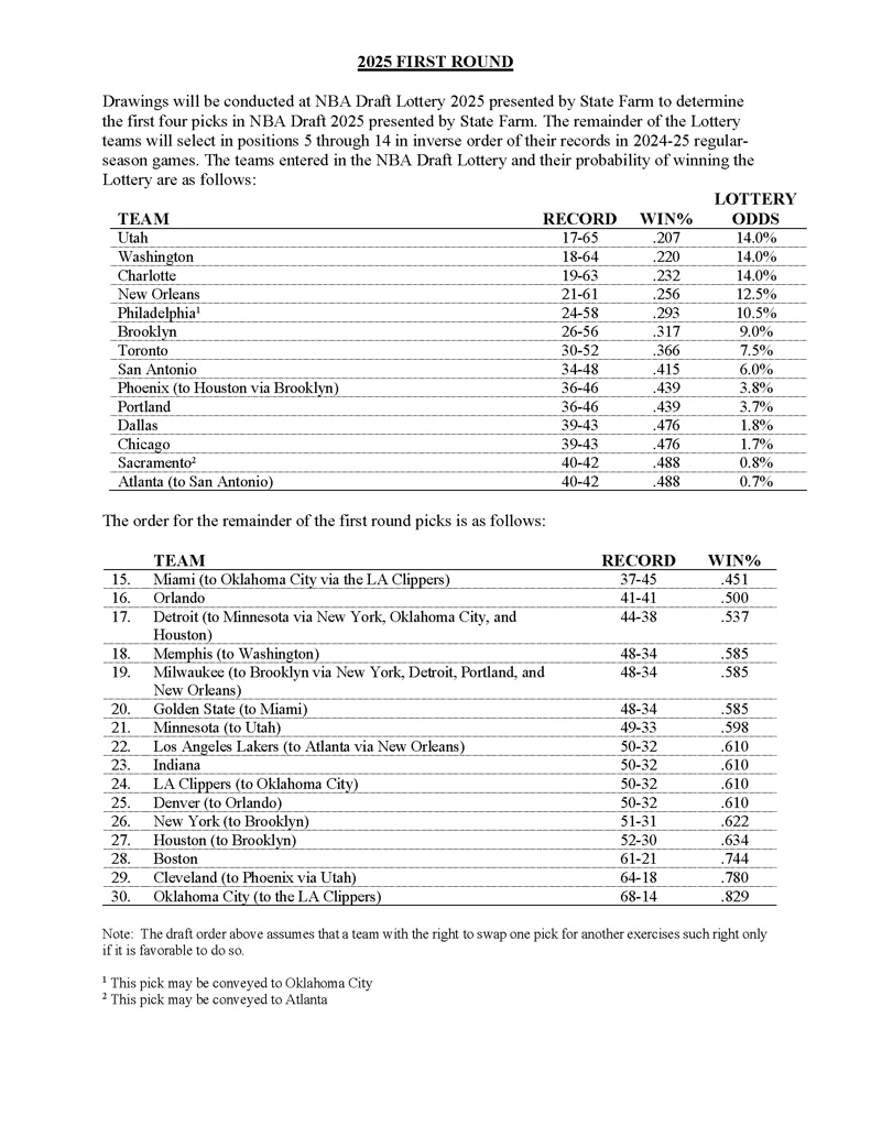 2025年NBA乐透抽签将于北京时间5月13日早上6:30/7:30进行(取决于那天季后赛赛程),选秀大会将于北京时间6月25日-26日进行。