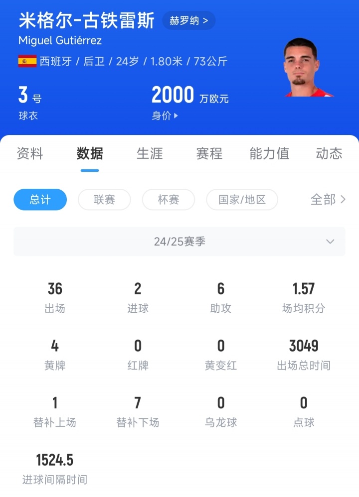 24岁的西班牙左后卫米格尔-古铁雷斯,上赛季代表赫罗纳出战36场比赛,贡献2粒进球和6次助攻。目前古铁雷斯的德转身价为2000万欧元。