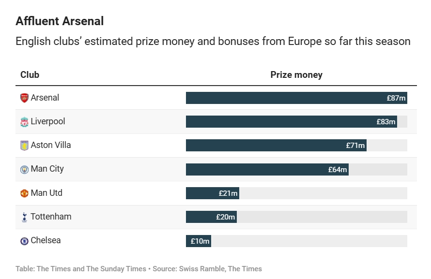 本赛季欧足联调整了欧战收入分配体系,使赛季期间的表现获得更多经济回报而非依赖历史成绩。与上赛季相比,欧冠的总奖金池增加了20%以上,欧足联为比赛胜利、小组赛阶段积分榜排名以及晋级淘汰赛提供了比例更高的奖金。而基于俱乐部历史表现计算的欧足联系数排名所占的奖金比例减少。例如,曼城未能进入淘汰赛阶段,其预计收入约为6400万英镑;而阿斯顿维拉晋级四分之一决赛后至少赚了7100万英镑。
