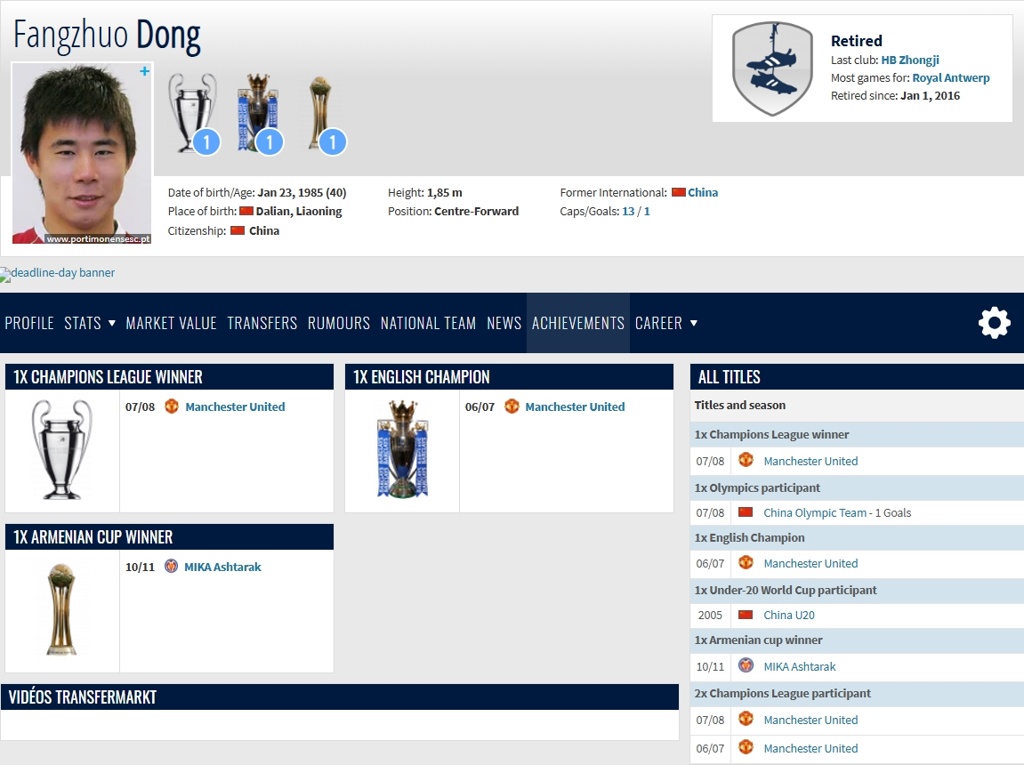 在德国转会市场的球员页面中,董方卓的荣誉一览标有2006/07赛季英超冠军。