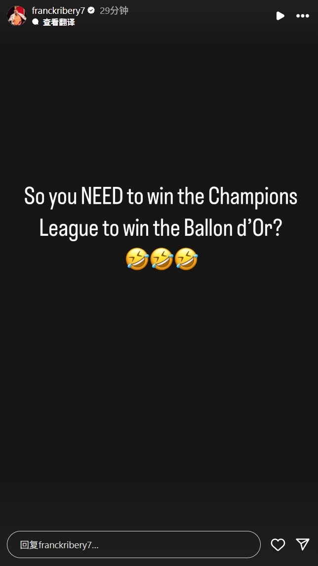 当天晚些时候,里贝里以特有方式做出了回应。他在ins上分享了一条动态,画面里只有一段配文和三个大笑表情:“所以说,必须赢得欧冠冠军才能获得金球奖咯?”
